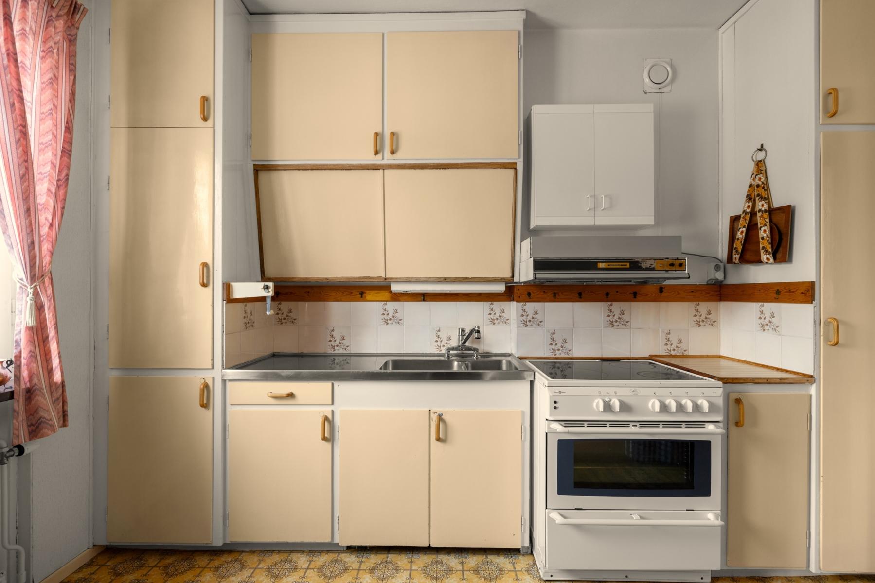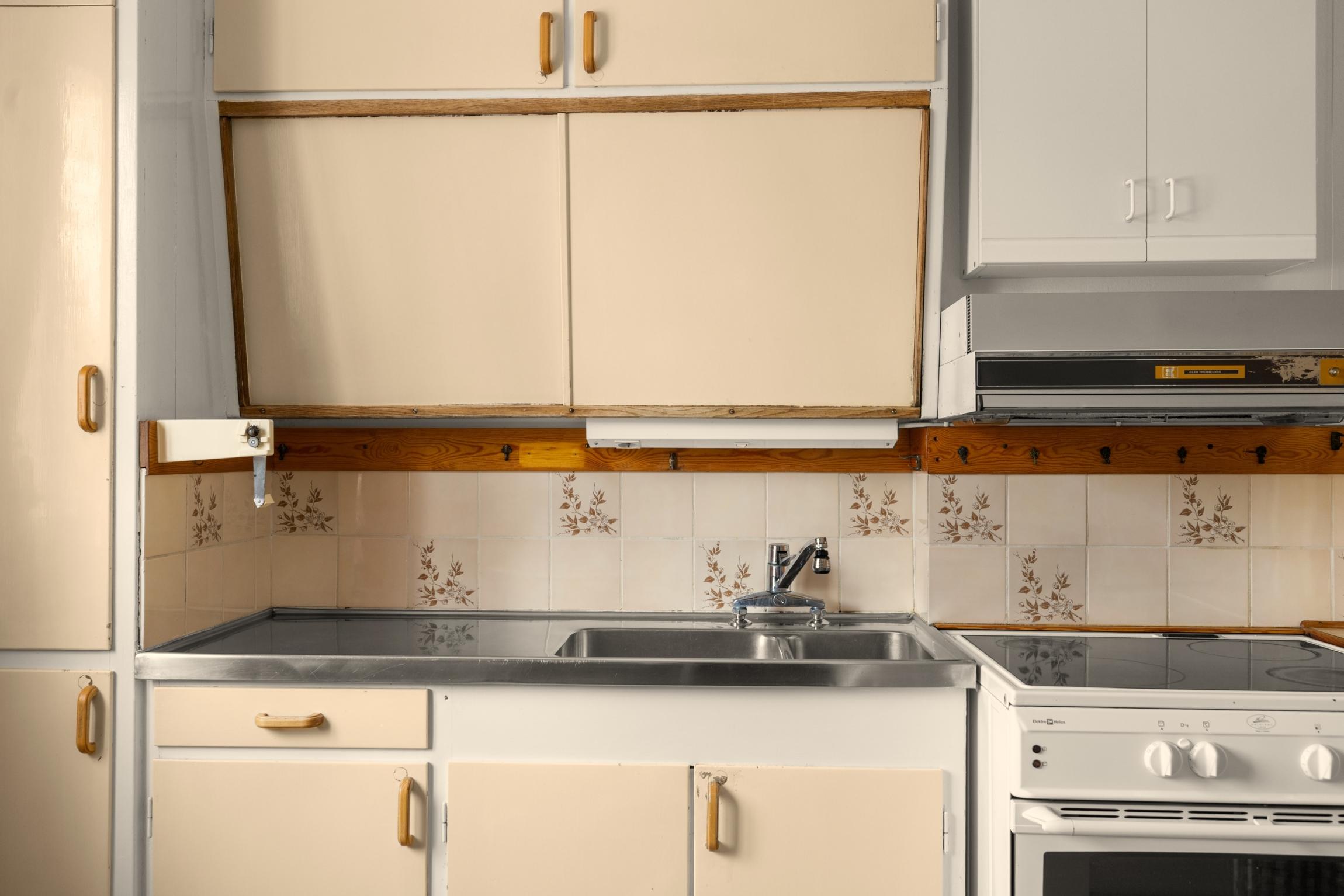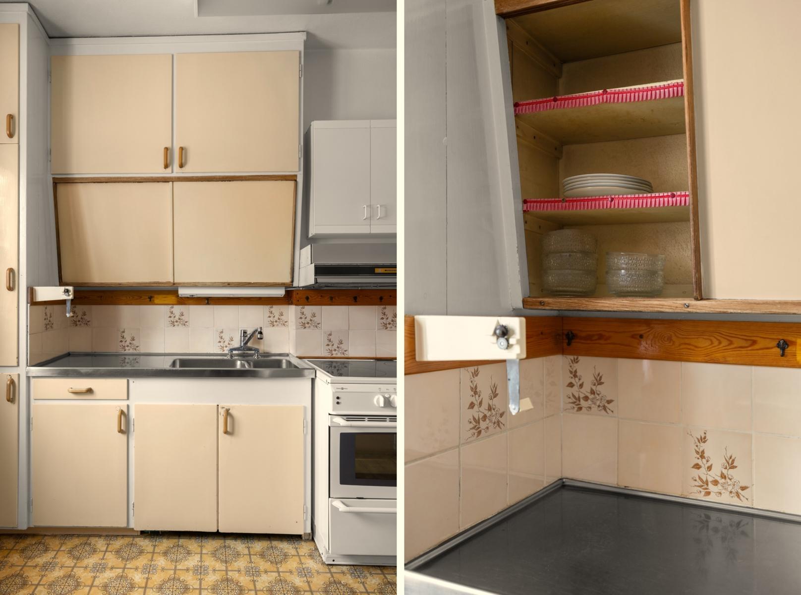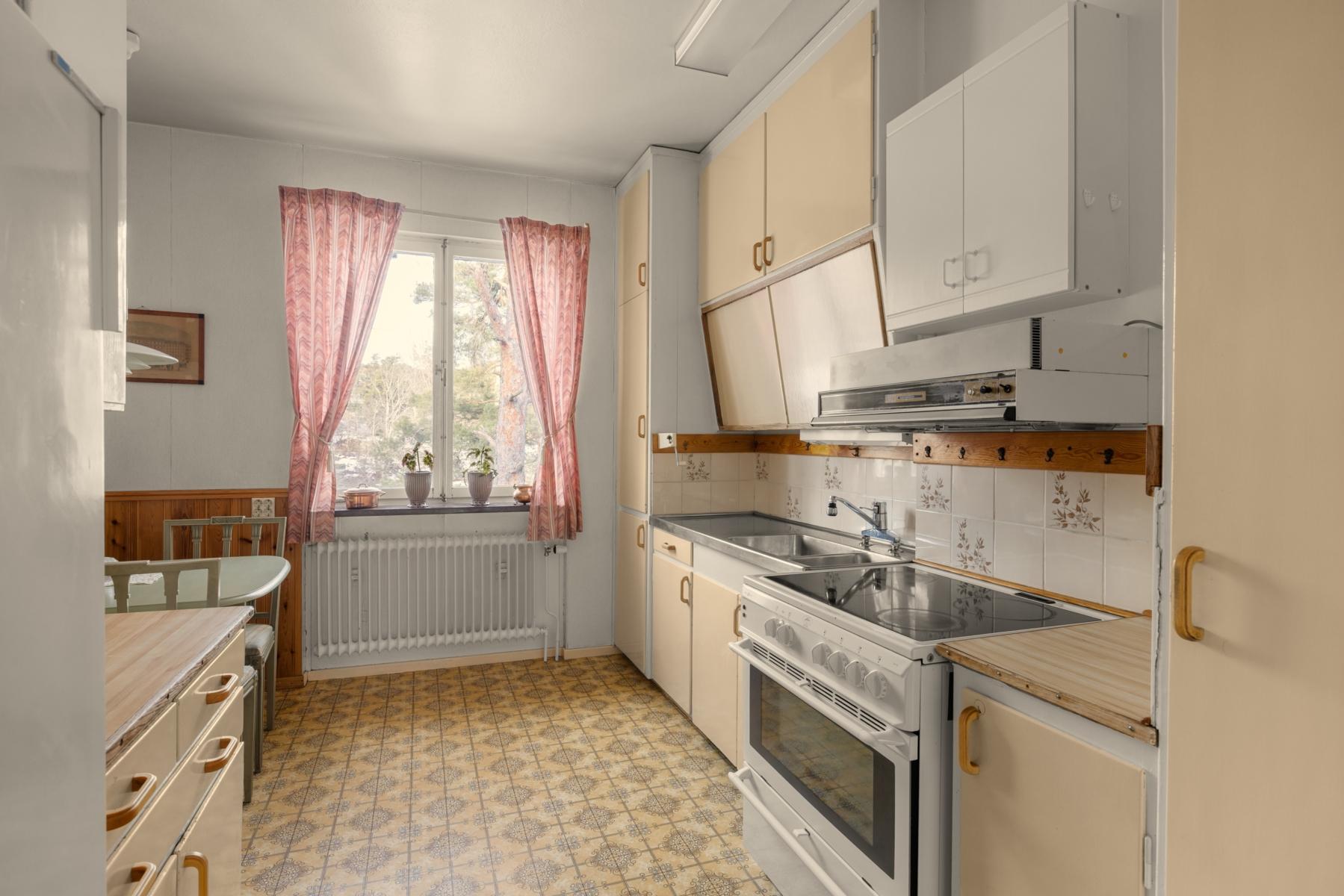 - Originalkök med snedställda överskåp med skjutdörrar