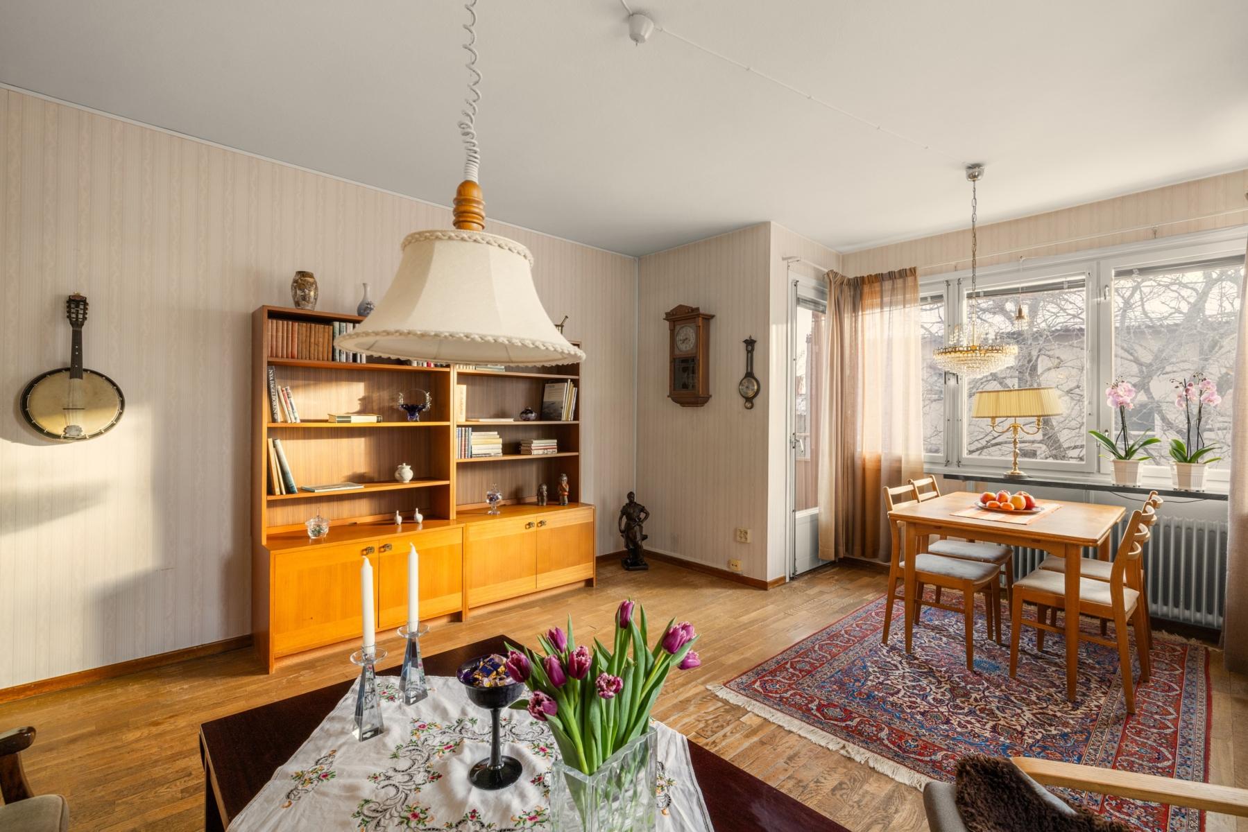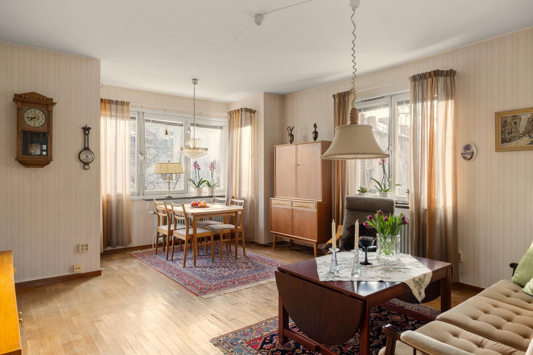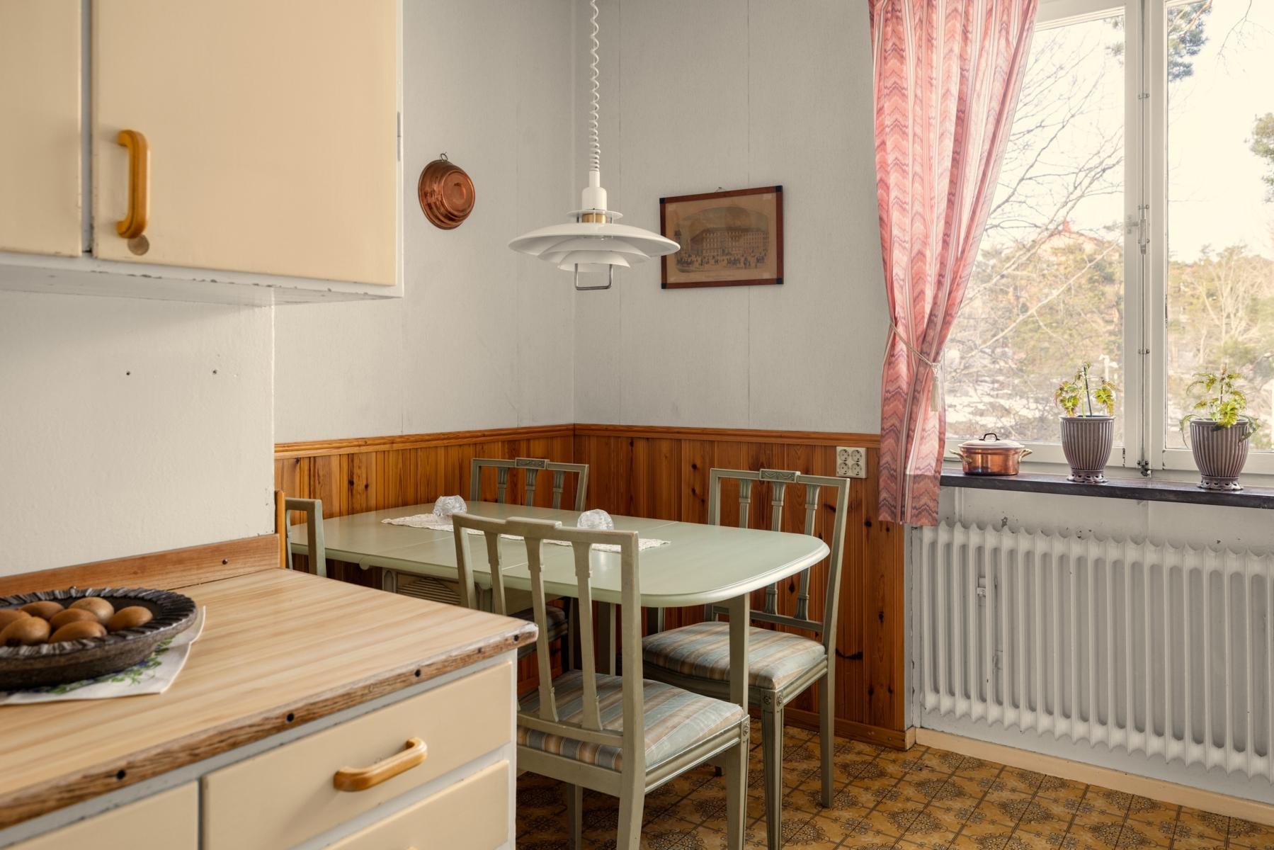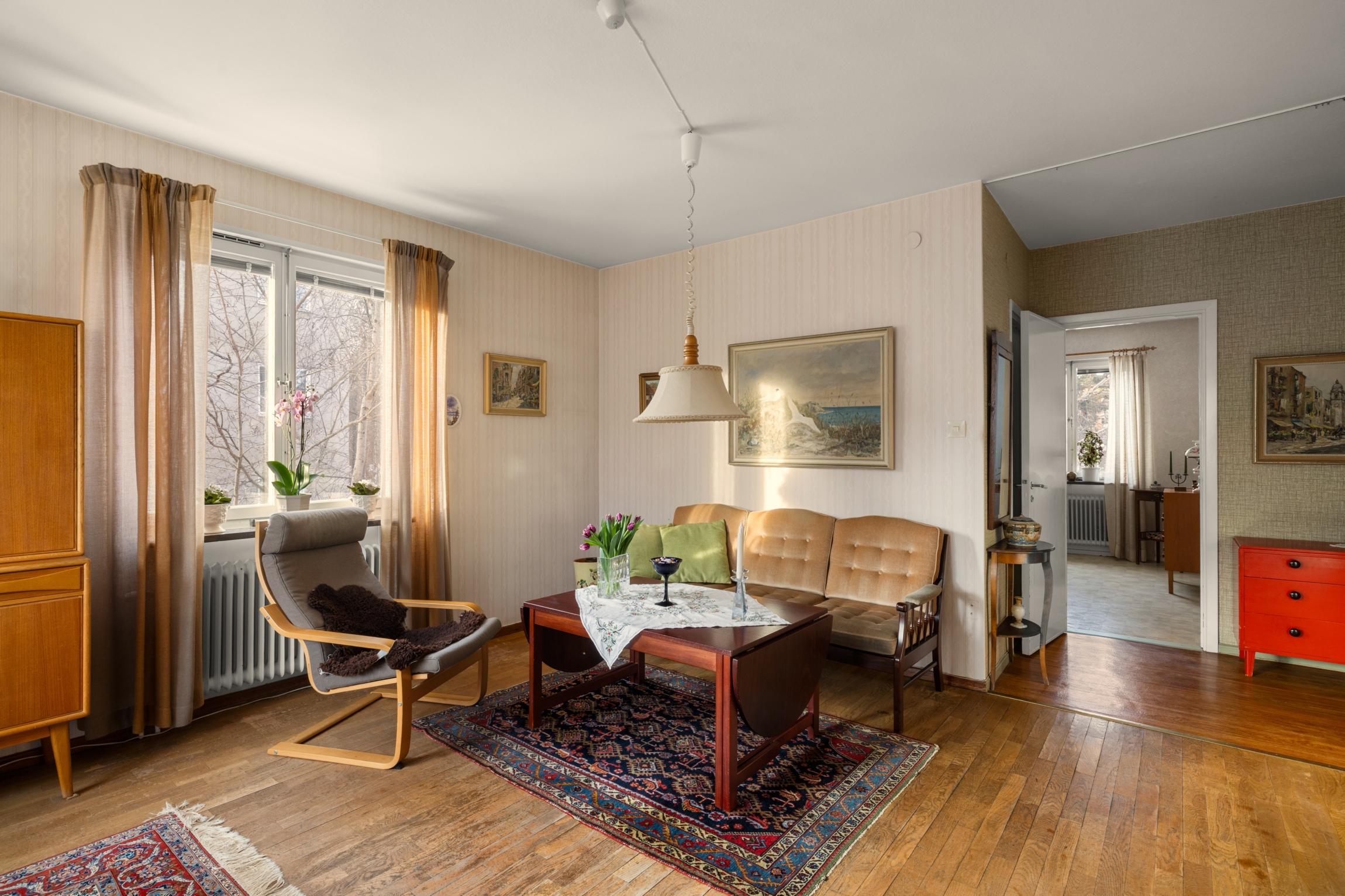 Välkommen tillbaka till 50-talet! Här finns chansen att förvärva en lägenhet som för en tillbaka till en tid då funktionen var i fokus och materialval var gedigna. En charmig 3:a om 70 kvm, belägen högst upp i huset med gavelläge som ger härligt ljusinsläpp från samtliga fyra väderstreck. Lägenheten har ett trivsamt burspråk i vardagsrummet som skapar rymd och ljus. Köket är bevarat i originalutförande med snedställda överskåp med skjutdörrar, och lägenheten har i övrigt många av sina ursprungliga detaljer kvar, vilket ger möjlighet att sätta sin egen prägel genom renovering/restaurering. Badrummet är kaklat med klinkergolv. Från vardagsrummet når du den soliga balkongen i bästa söderläge, perfekt för avkoppling, soliga frukostar eller kvällsmiddagar. Detta är ett hem med stort ljusflöde, gavelläge och karaktär, som väntar på nya ägare som vill uppdatera ytskikt och skapa sitt drömhem i ett attraktivt läge.