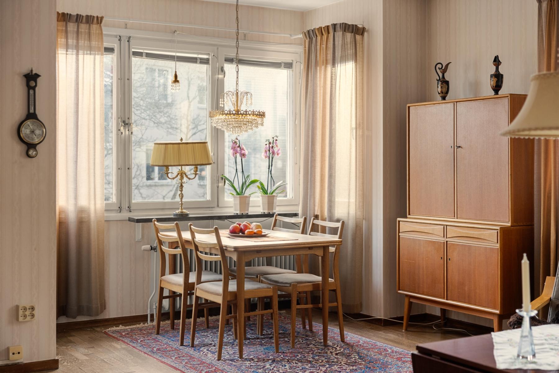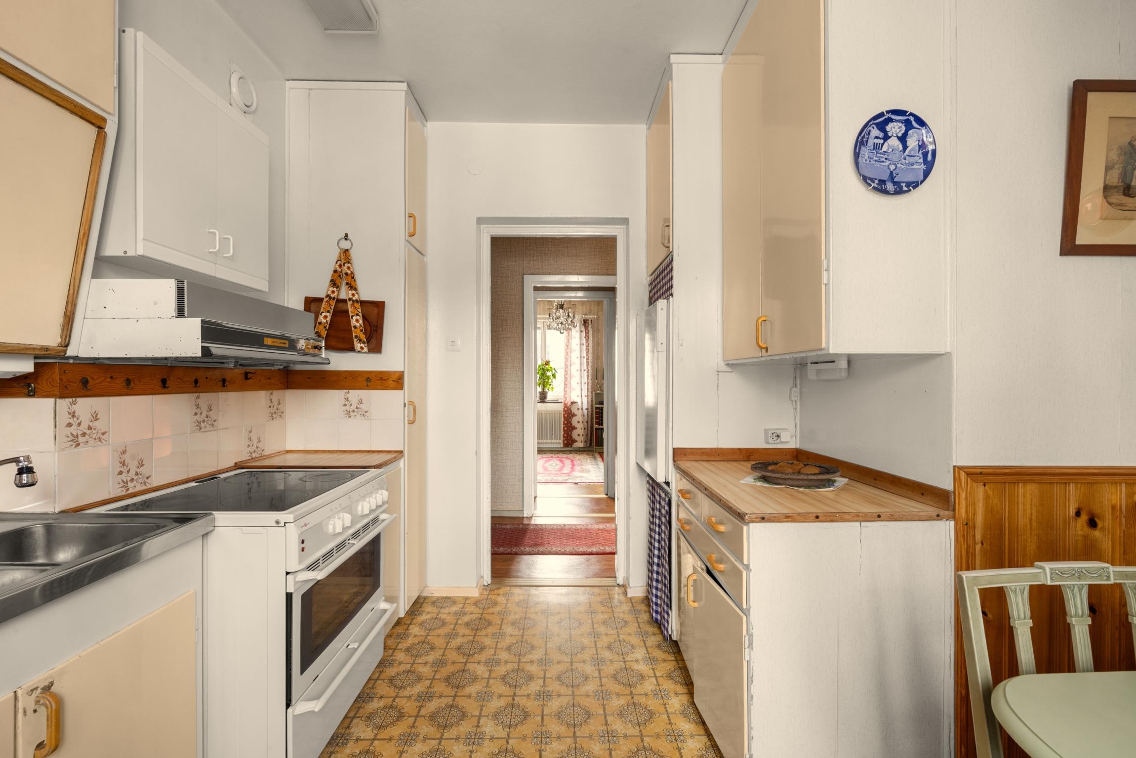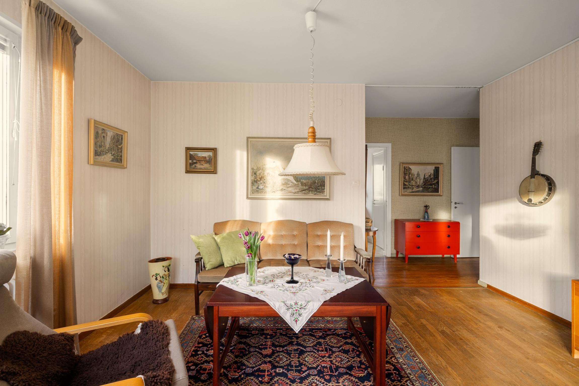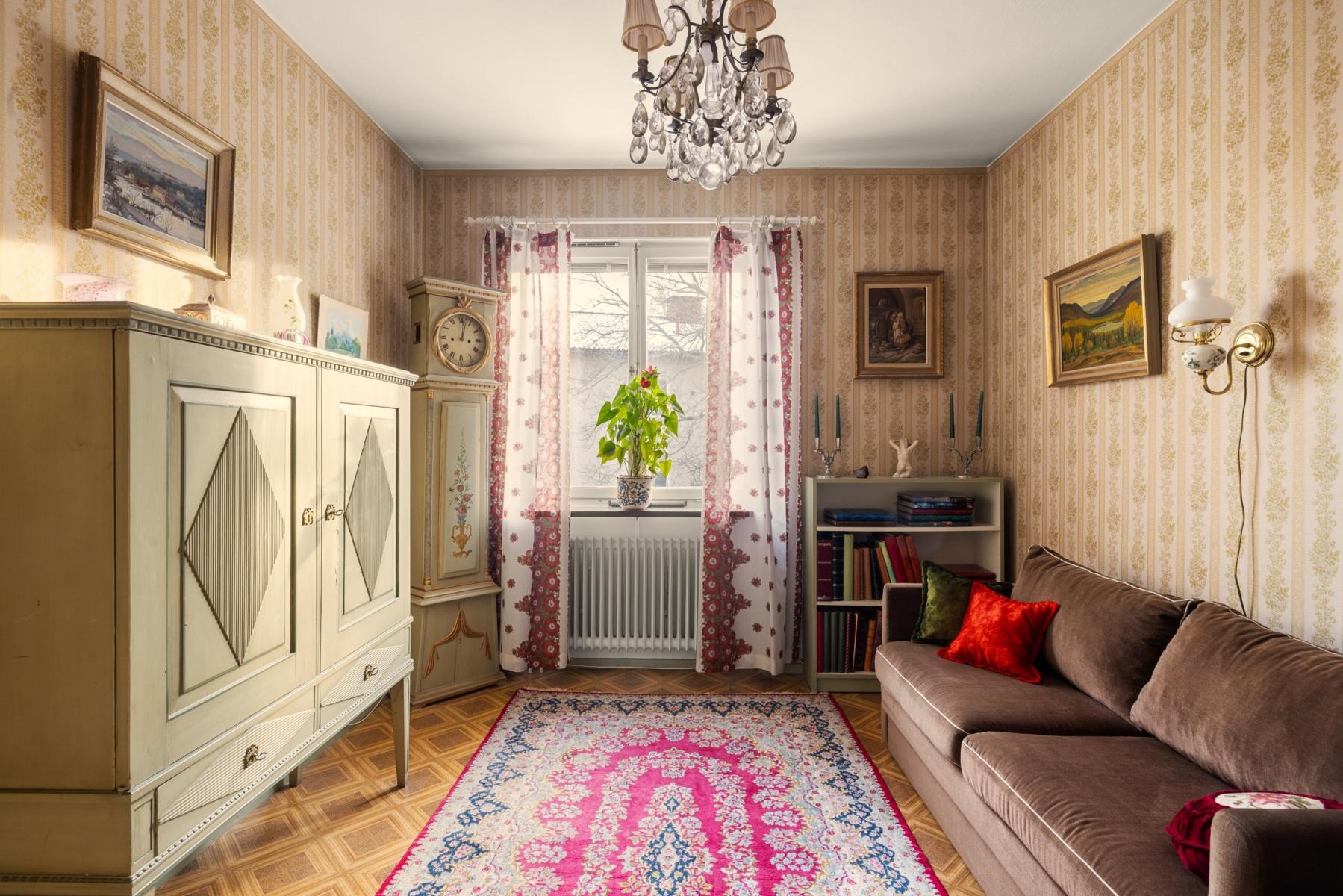 Välkommen tillbaka till 50-talet! Här finns chansen att förvärva en lägenhet som för en tillbaka till en tid då funktionen var i fokus och materialval var gedigna. En charmig 3:a om 70 kvm, belägen högst upp i huset med gavelläge som ger härligt ljusinsläpp från samtliga fyra väderstreck. Lägenheten har ett trivsamt burspråk i vardagsrummet som skapar rymd och ljus. Köket är bevarat i originalutförande med snedställda överskåp med skjutdörrar, och lägenheten har i övrigt många av sina ursprungliga detaljer kvar, vilket ger möjlighet att sätta sin egen prägel genom renovering/restaurering. Badrummet är kaklat med klinkergolv. Från vardagsrummet når du den soliga balkongen i bästa söderläge, perfekt för avkoppling, soliga frukostar eller kvällsmiddagar. Detta är ett hem med stort ljusflöde, gavelläge och karaktär, som väntar på nya ägare som vill uppdatera ytskikt och skapa sitt drömhem i ett attraktivt läge.