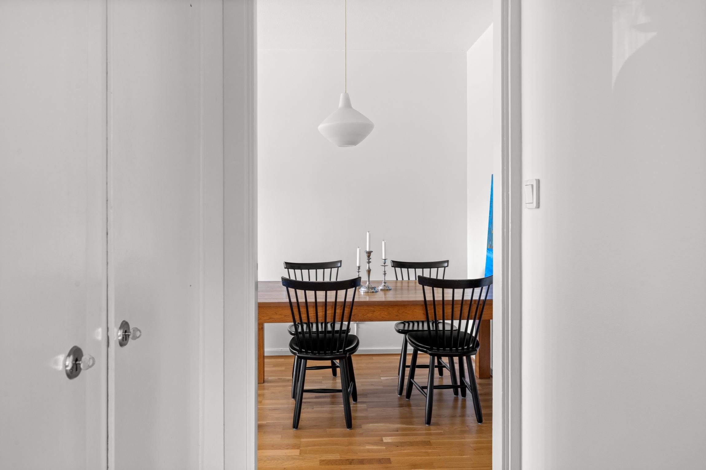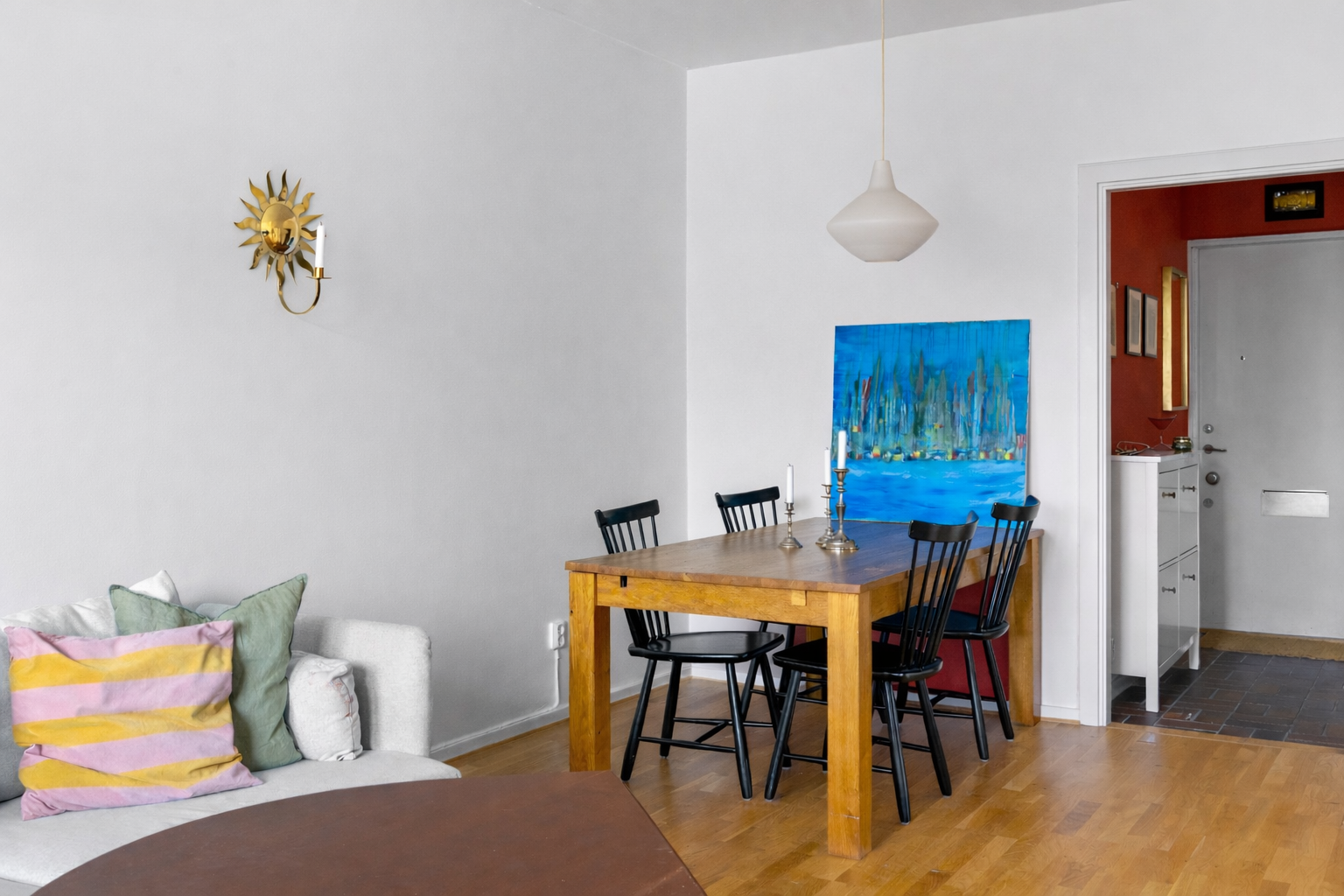 • VardagsrumVäl tilltaget vardagsrum med plats för större sittgrupp, TV-möbel samt matbord för 6 personer. Ekparkettgolv och målade väggar. Här finns även utgången till den trivsamma balkongen i bästa söderläge med sol hela dagen.