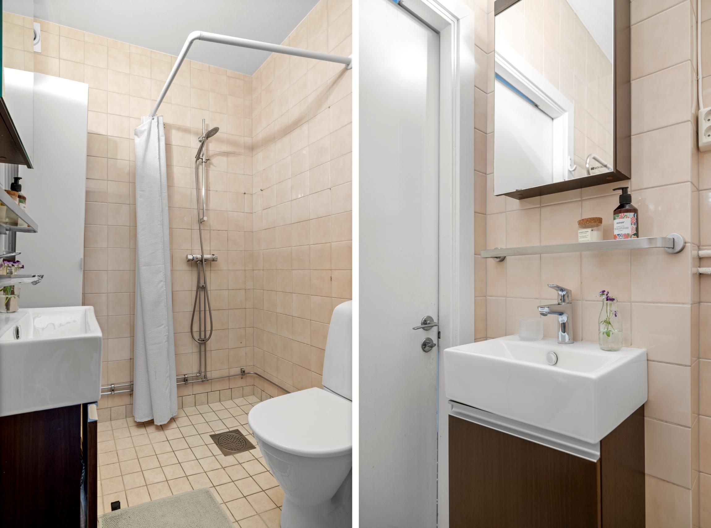 • BadrumHelkaklat badrum med klinkergolv. I badrummet finns WC, tvättställ med kommod, förvaringsskåp samt duschhörna.