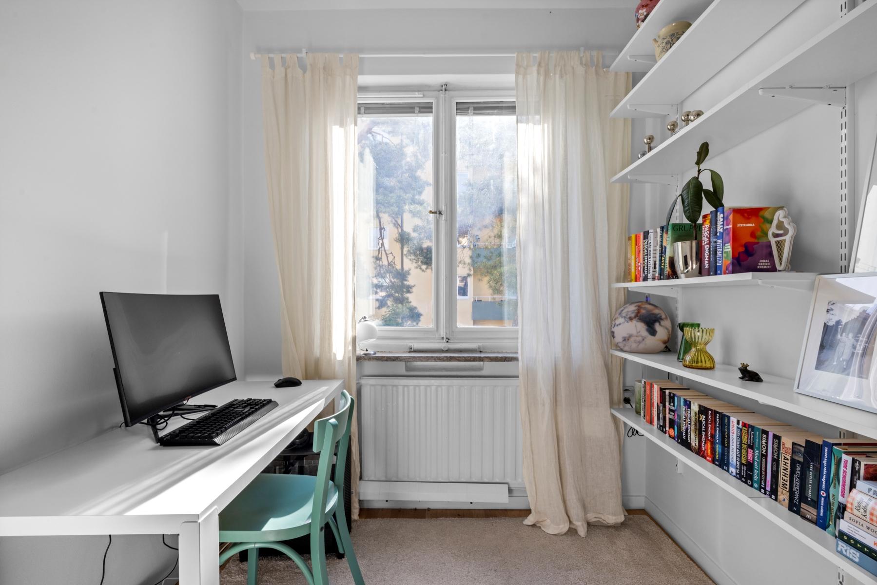 • Sovrum 2Ett mindre sovrum som rymmer säng och mindre arbetshörna. En garderob med bra förvaring. Heltäckningsmatta och målade väggar.