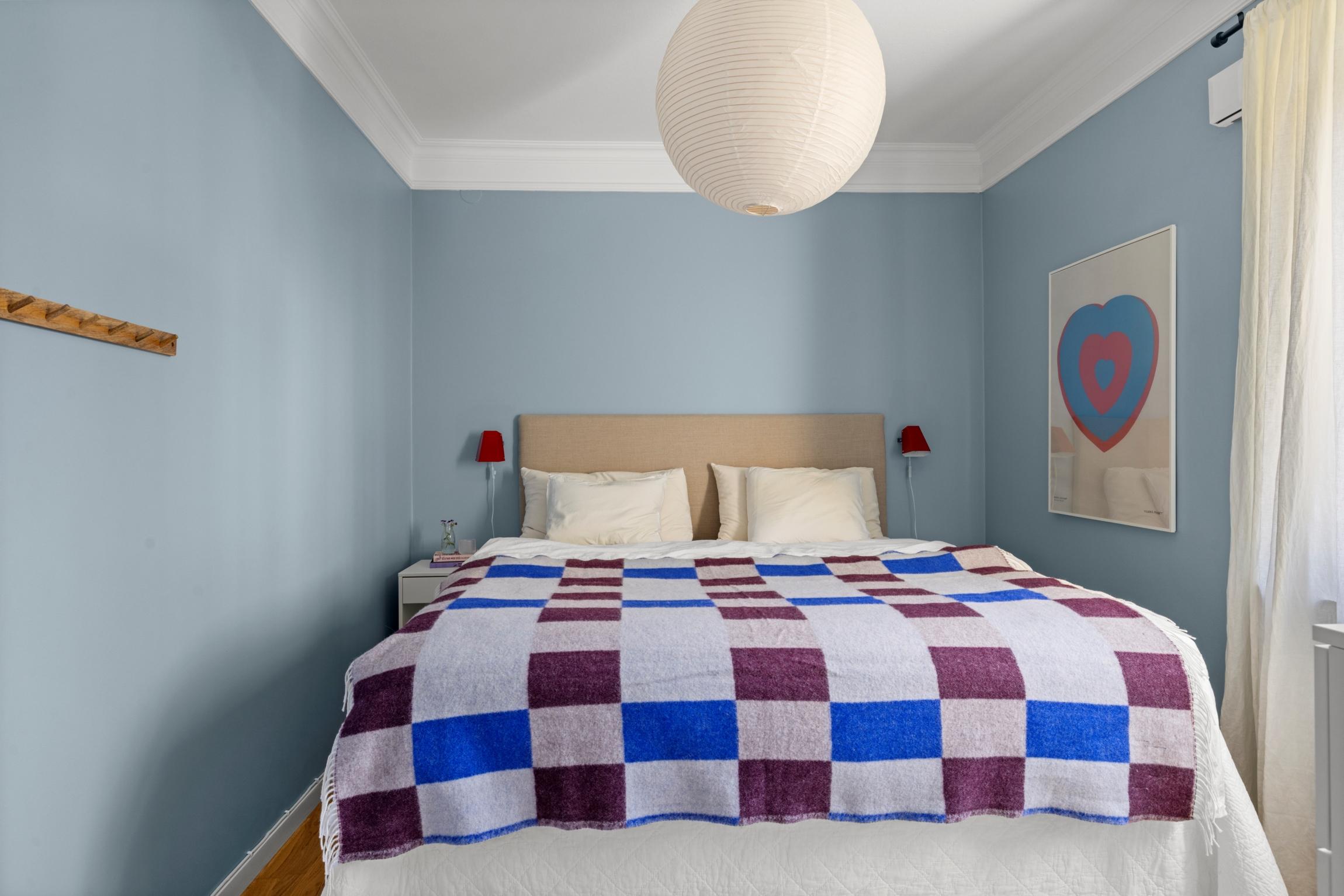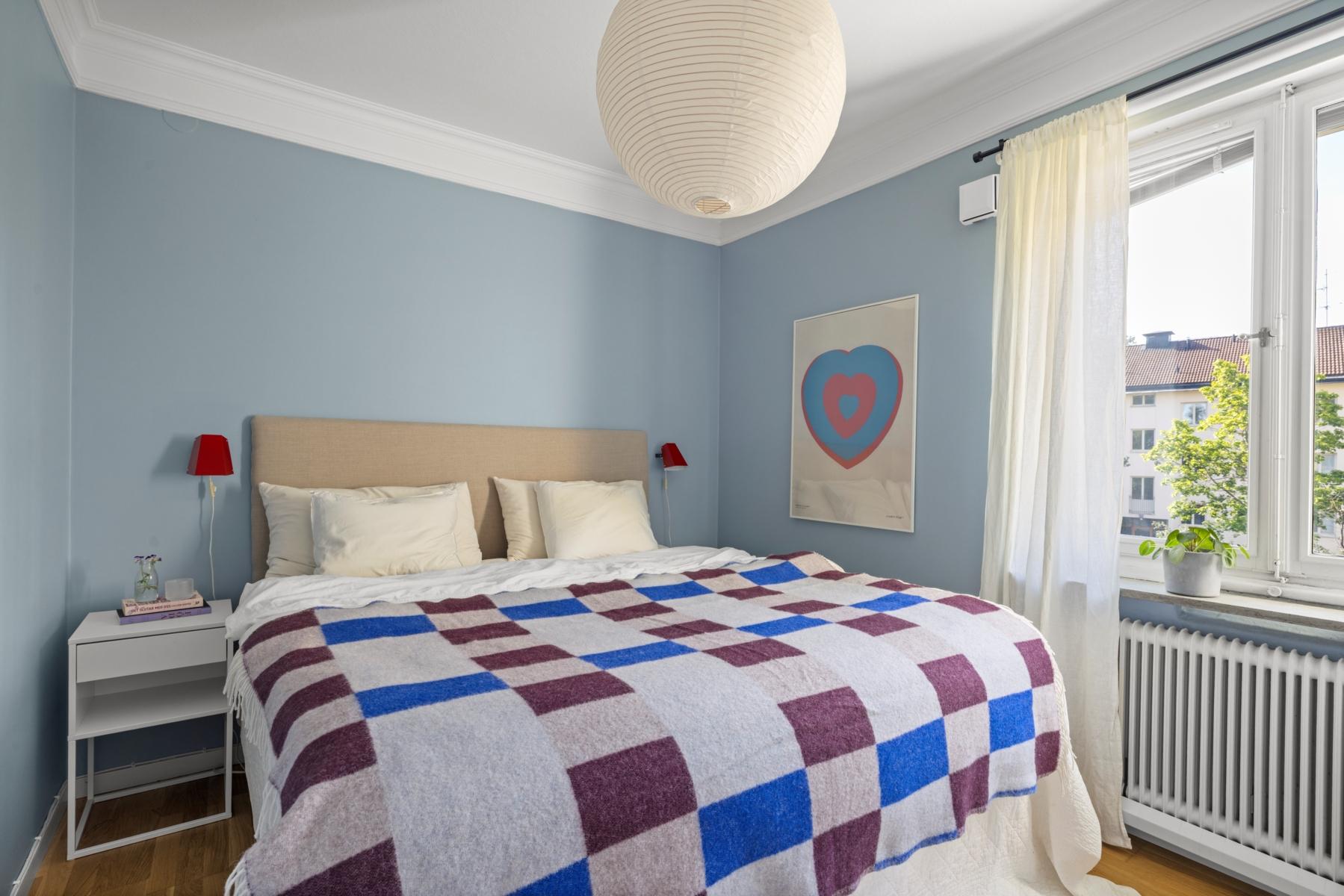 • Sovrum 1Rymligt sovrum med plats för dubbelsäng, nattduksbord samt byrå. Parkettgolv och målade väggar.