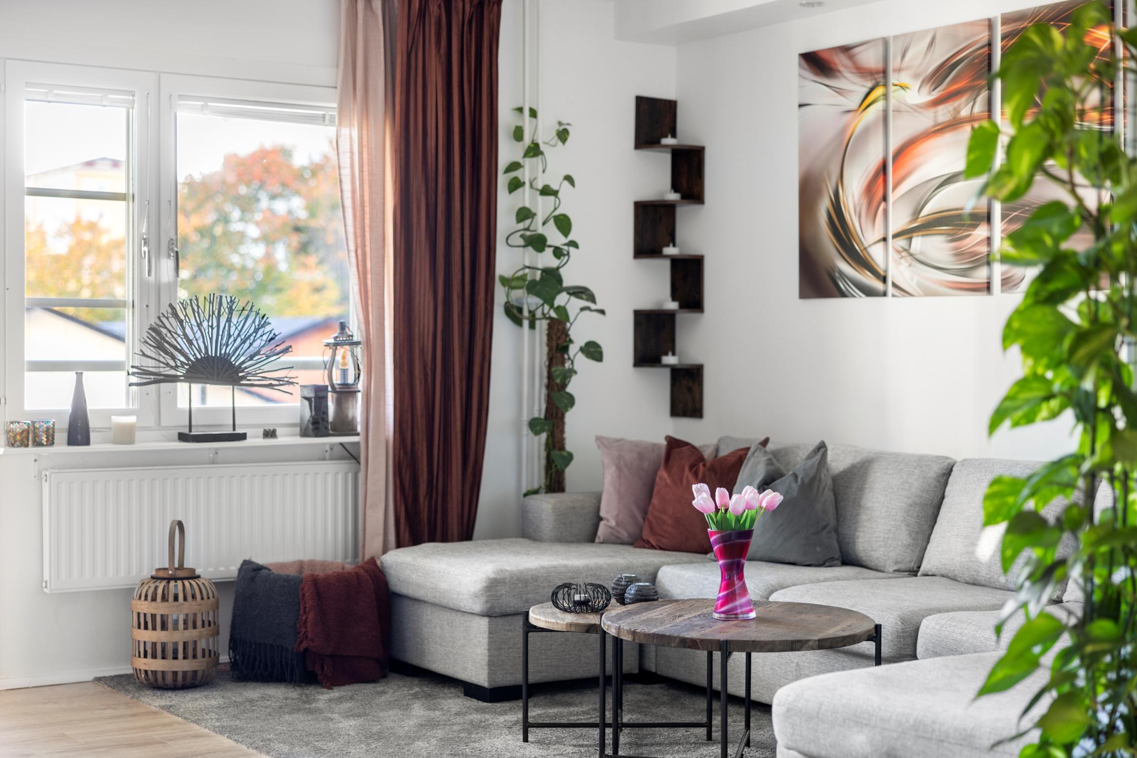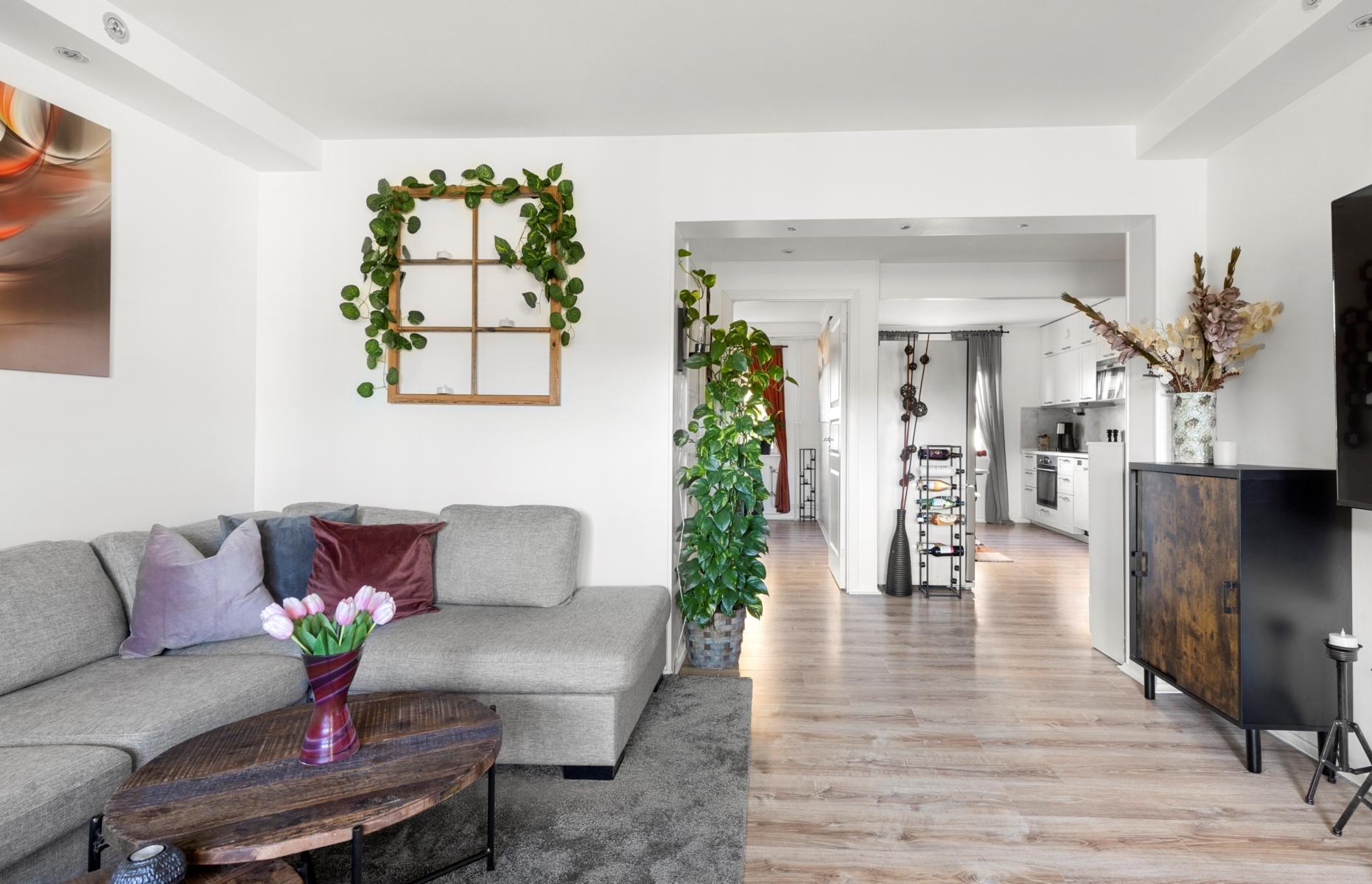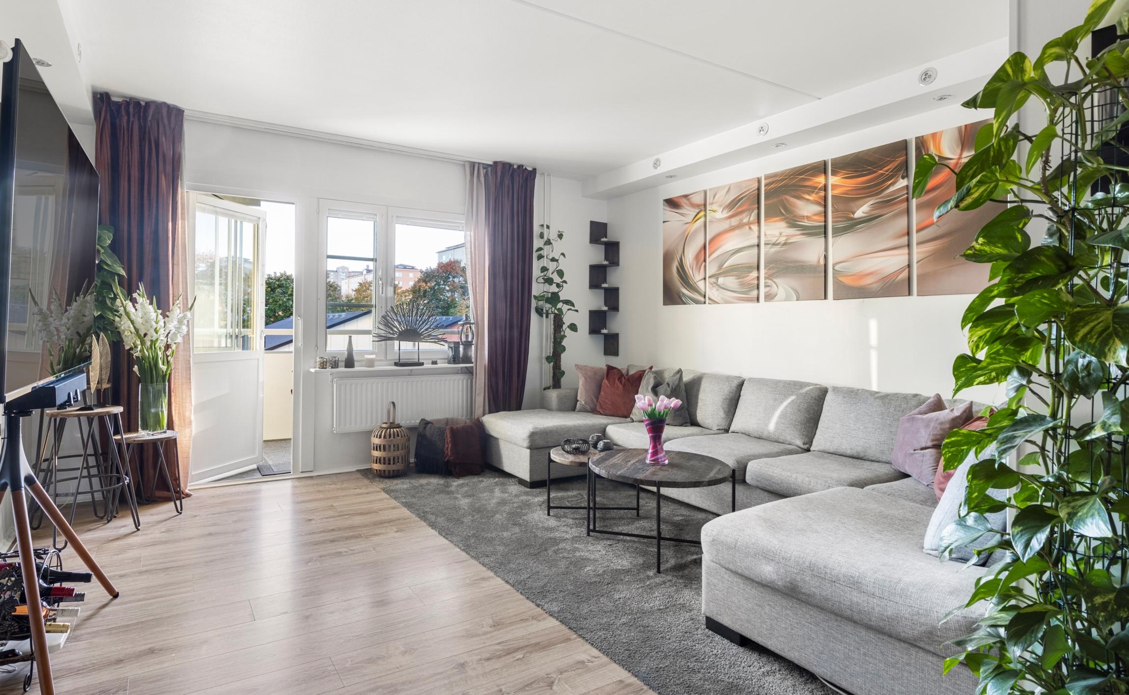- VardagsrumLuftigt vardagsrum med plats för stor sittgrupp och trivselmöblemang. Från vardagsrummet nås den stora inglasade balkongen i bästa söderläge med sol hela dagen. Plats finns för sittmöbler och odlingar. Balkongen ligger i ett öppet läge utan hus framför och har således minimalt med insyn.