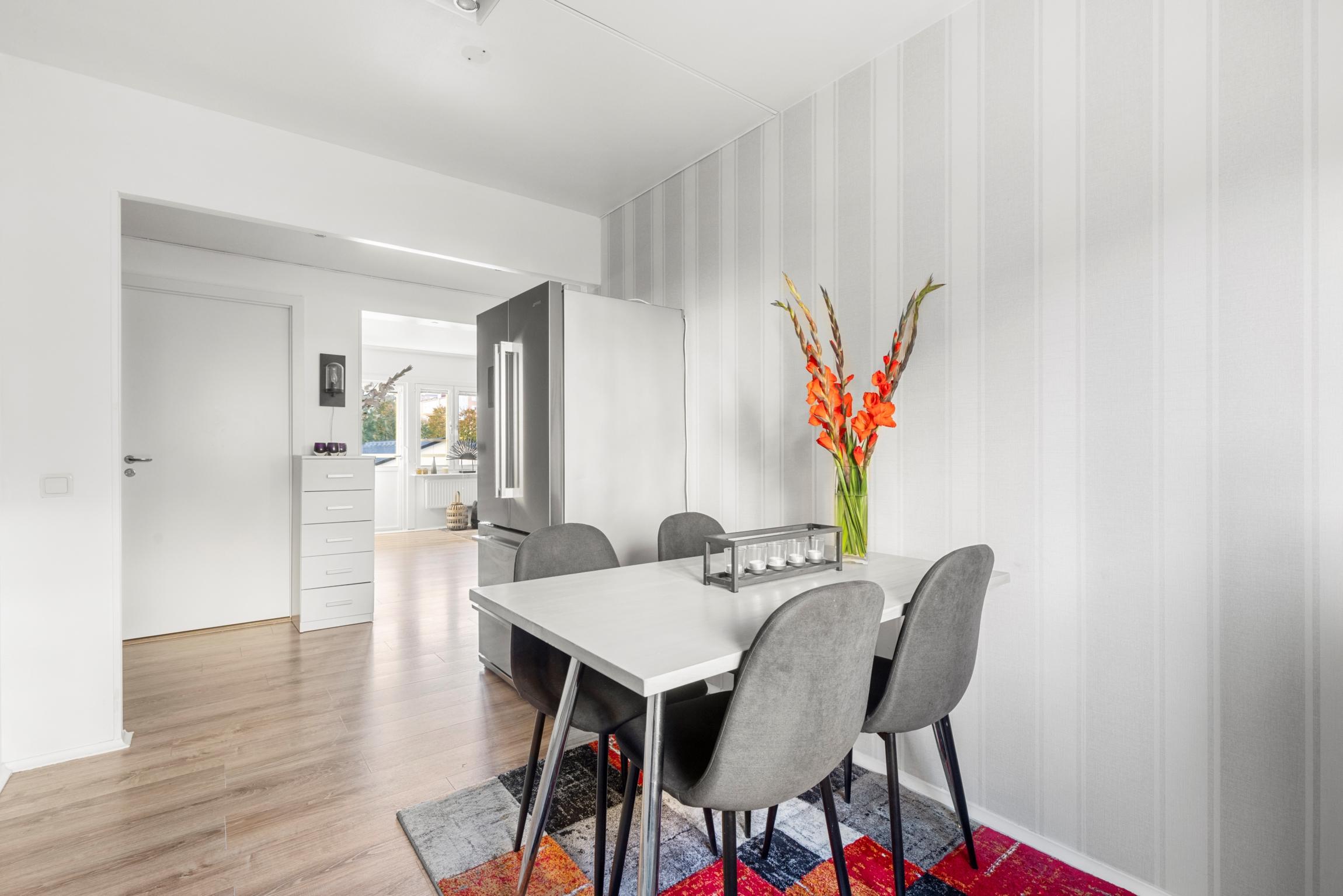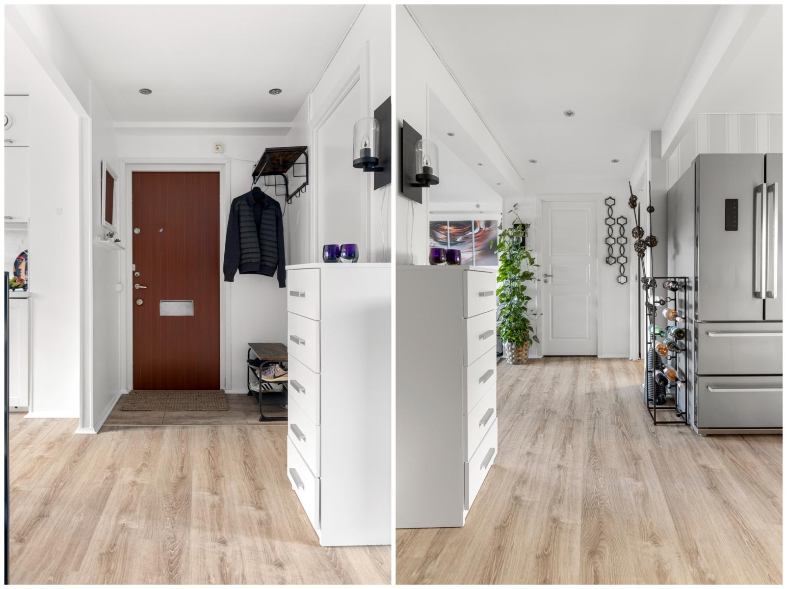 - HallVälkomnande öppen hall med plats för avhängning av ytterkläder och skoförvaring. Det finns även plats för byrå eller annat mindre möblemang.