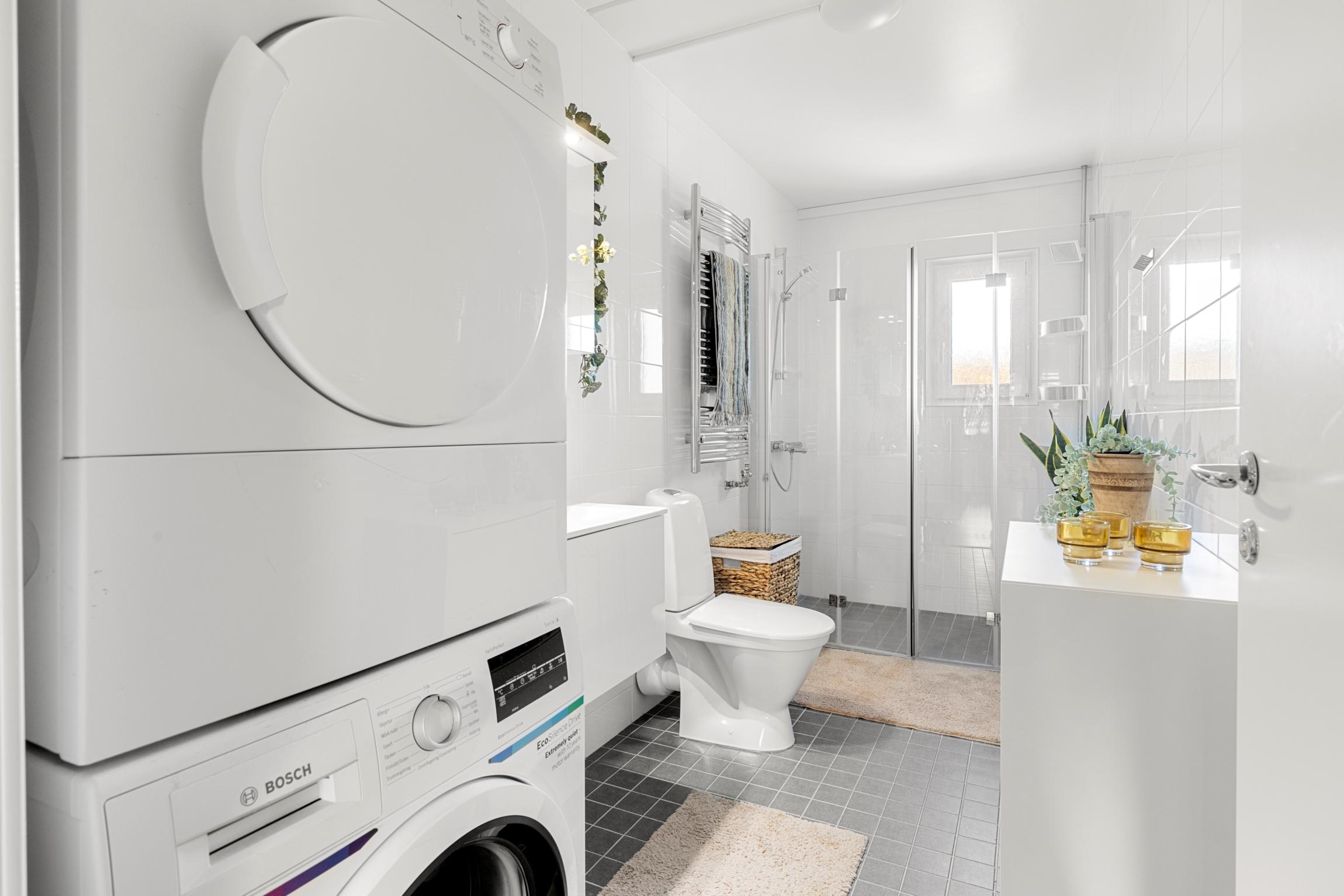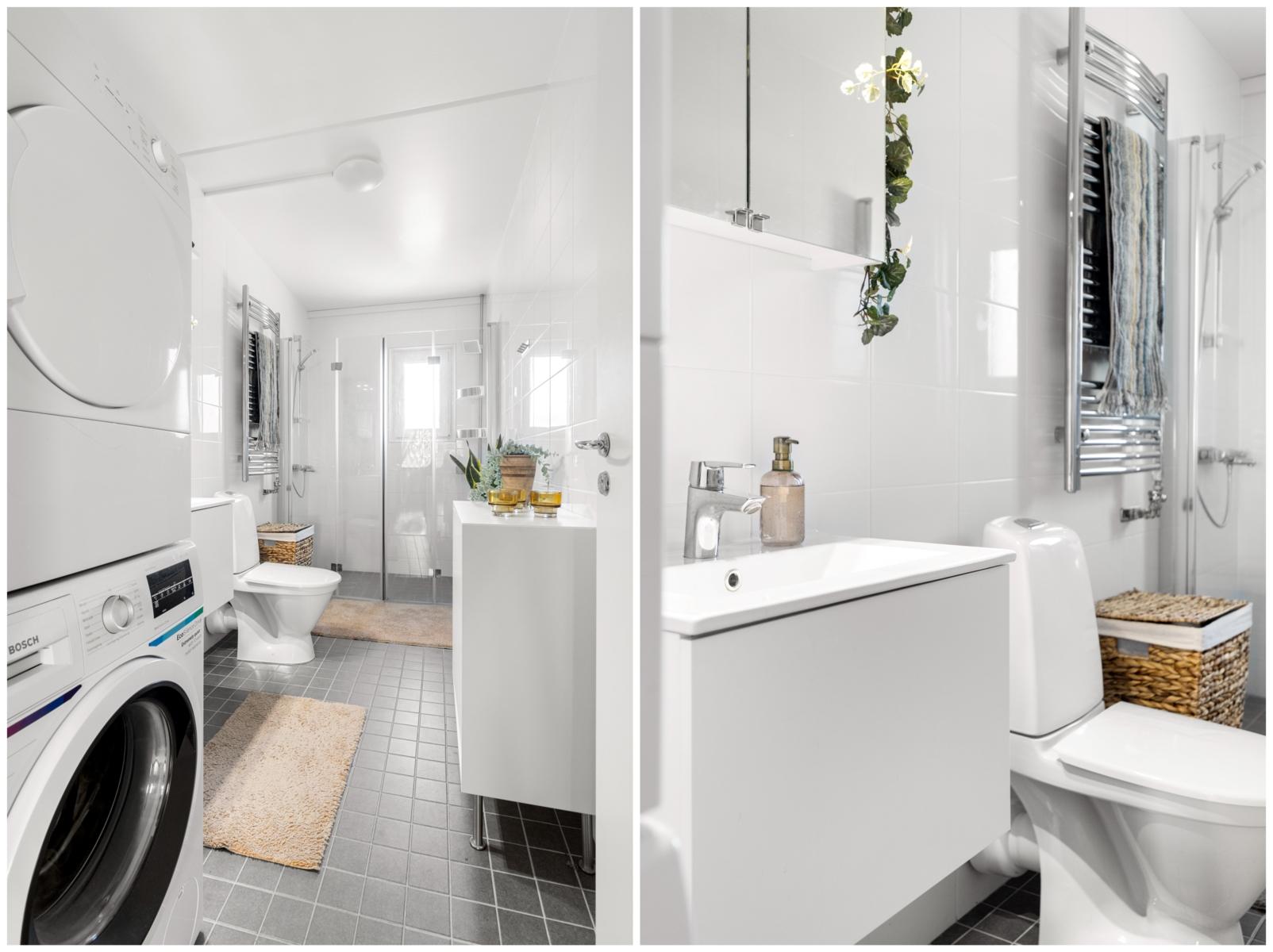 - BadrumTopprenoverat stambytt badrum (renoverat 2021) med helkaklade väggar och klinkergolv. Badrummet har en rymligt duschhörna för en till två personer, WC, tvättställ samt tvättpelare med tvättmaskin och torktumlare.