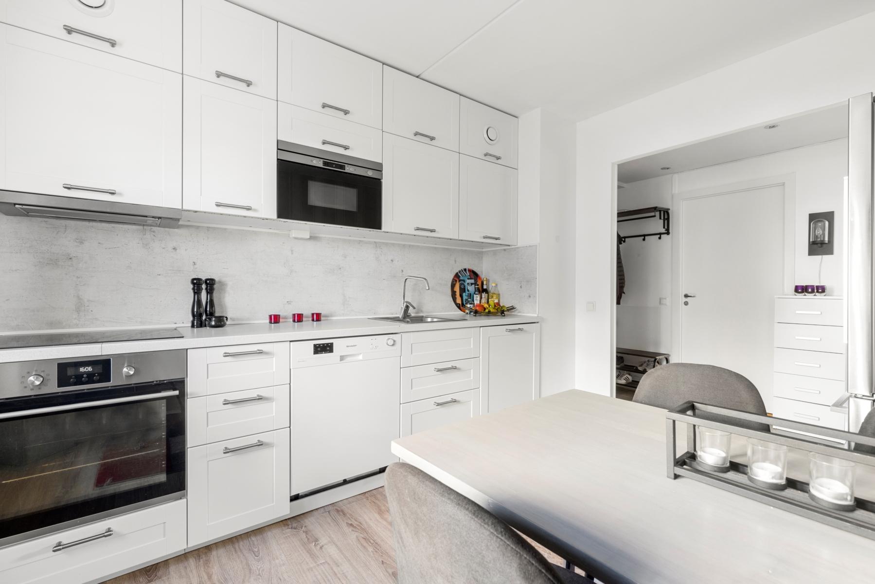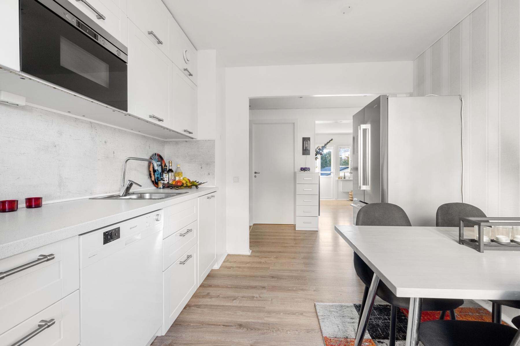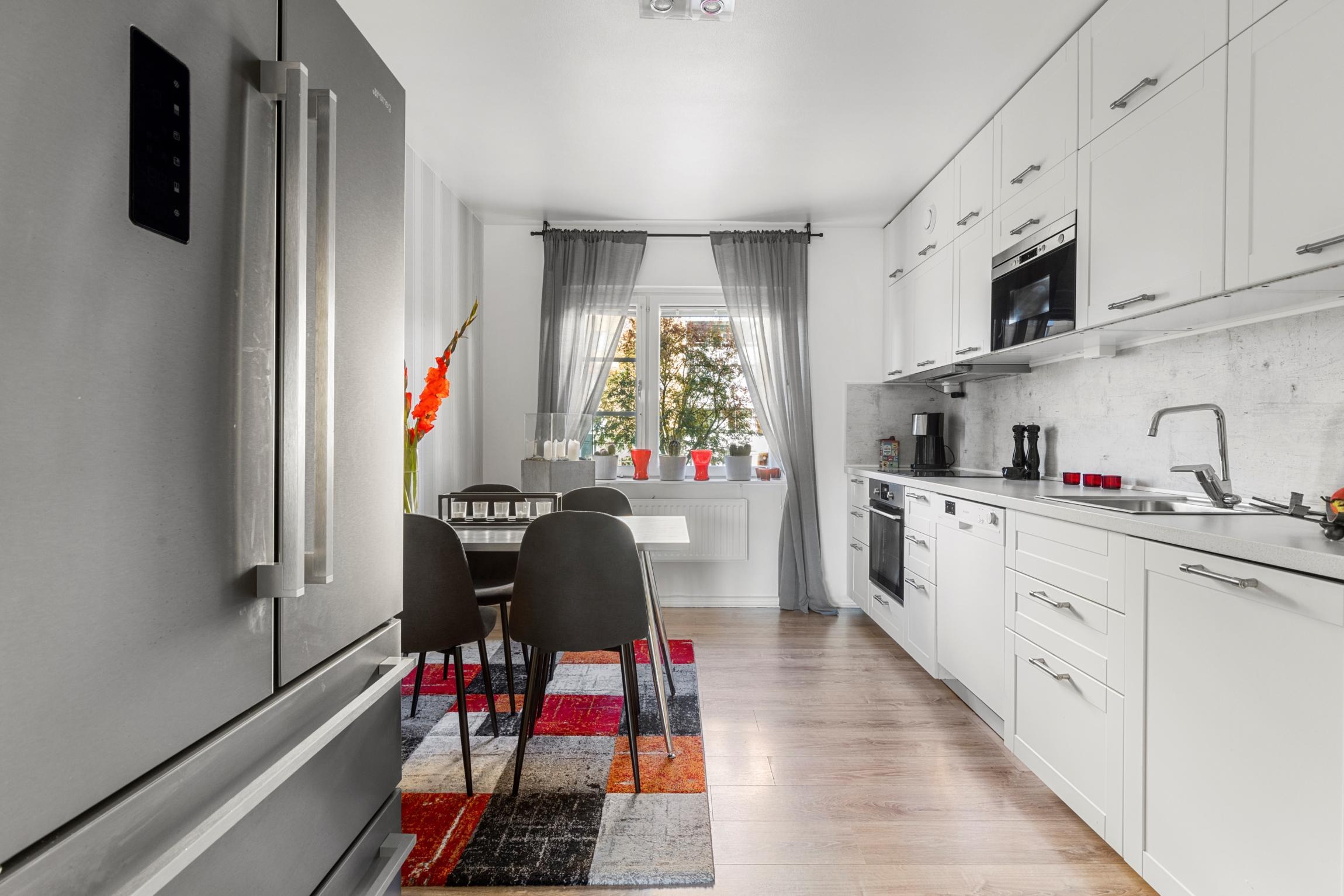 - KökFint renoverat kök med mycket gott om förvaringsskåp och arbetsytor. Matplats med plats för 4-6 personer. Utsikt mot föreningens bilfria innergård. I köksutrustningen finns spishäll, spisfläkt, diskmaskin, mikro samt "side by side" kyl och frys.