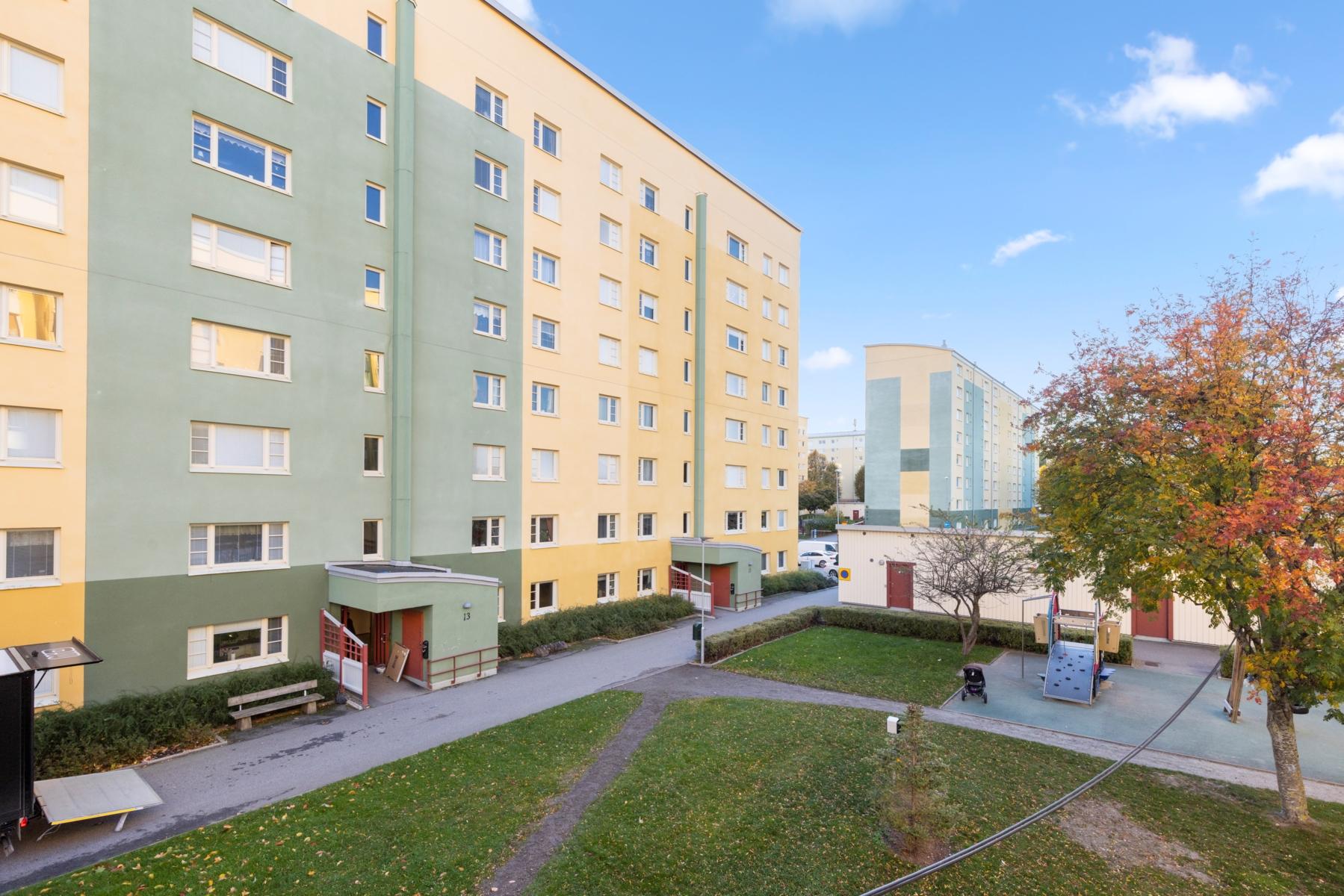 Från lägenheten är det ca 5 minuters promenad till T-bana och bussar som tar dig till Stockholm City på ca 35 min. Ett stenkast bort ligger Hallunda Centrum med diverse butiker, banker, apotek, systembolag mm. I närheten finns flertalet skolor och förskolor.